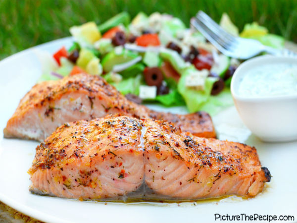 Hi everyone! I’m Noreen from PictureTheRecipe.com. Sara and Jessica have been kind to allow me to share one of my recipes on their wonderful blog here. Sticking to their clean eating theme, I’ve selected an easy salmon recipe that’s packed with Mediterranean flavors, which is so simple to make, it’s perfect for a special week night dinner. The deliciously flavorful salmon goes great with a cold tzatziki sauce (cucumber and yogurt sauce) and makes a whole meal when paired with a simple greek salad of lettuce, baby spinach, cucumber, tomato, red onion, kalmatta olives and feta dressed with the same tzatziki or any dressing of your choice. Enjoy!
